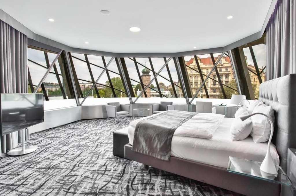 PAR. Vill du bo i Prags kanske roligaste byggnad kan du boka ett rum på Dancing House Hotel, Tančící dům hotel. Hotellet ligger på två plan i en byggnad som ser ut som ett dansande par, med ett fint läge vid Moldaufloden. Byggnaden ritades av de världsberömda arkitekterna Frank Gehry och Vlado Milunić och har vunnit designpris. Du bor i moderna rum, vissa med fönster som ger en fantastisk vy. Det finns en restaurang och en bar där du kan äta och dricka gott efter en lång dag med sevärdheter. Hotellet erbjuder även gratis wifi.